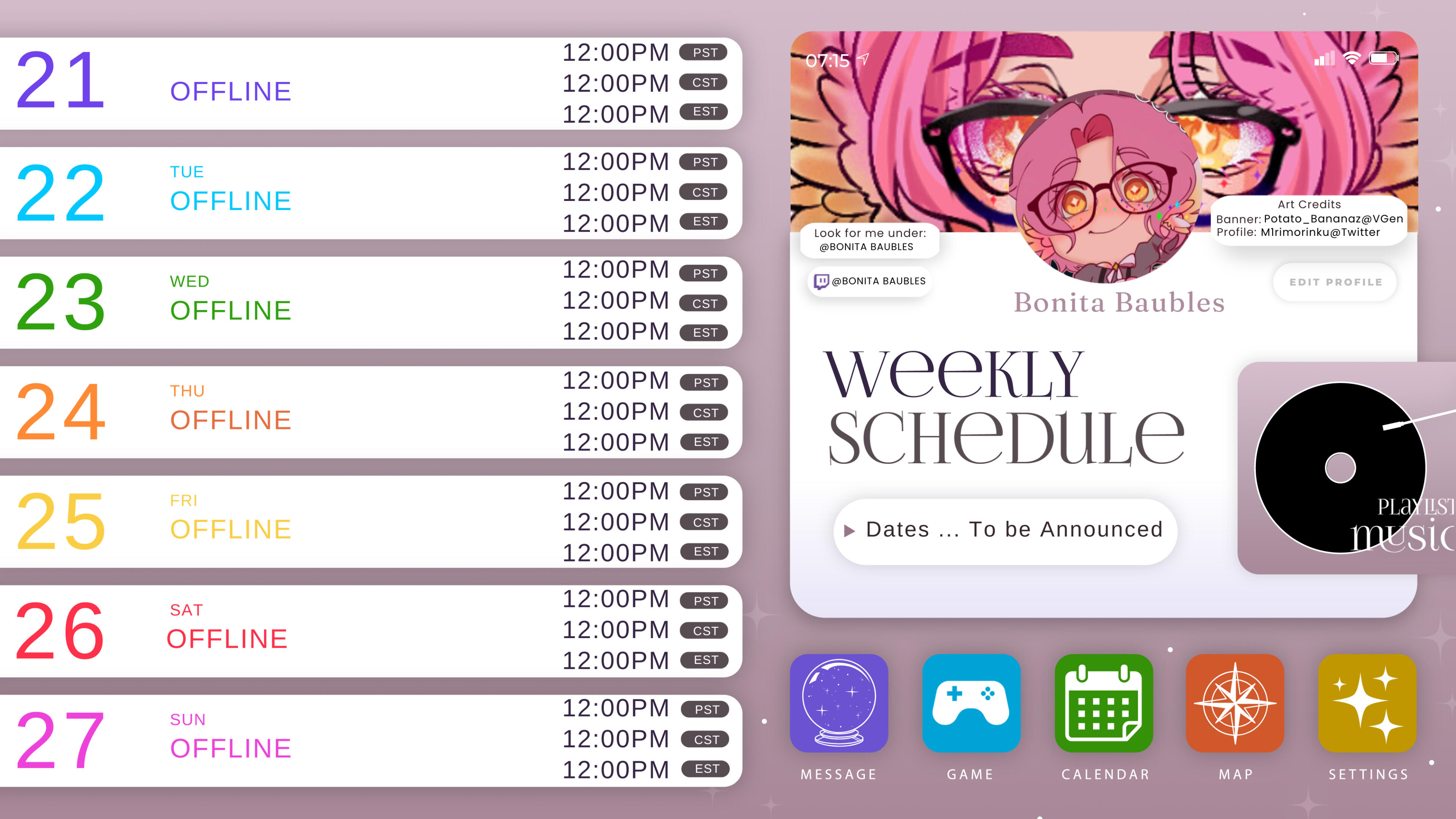 After many moons apart of the Lunabelle Guild, this little bird made the big decision to fly solo. Bonita spends her time running Bewitching Baubles; a pop-up shop that quite literally pops into towns, cities, and even other realms.Always on the look out for her next muse, or another wonderful customer who appreciates magical trinkets, she doesn't stay in one place for long and continues to feed her wanderlust.While many believe she will return to her adventuring roots, and become the legendary support witch she was meant to be, she can't help but feel frustrated at their one track mind. People pay her shop no mind, and the coven hasn't had any new members in months. Who wouldn't want to join a coven for artists and art lovers alike?Despite the doubt she strives to prove wrong, she holds her dream of building a community that thrives on creativity close to her heart. Thanks to her friend, she has decided to give a crack at being a "Vtuber" to attract customers or members to her shop. People who appreciate creativity as much as she does, and people who will help bring hope to her dying shop.